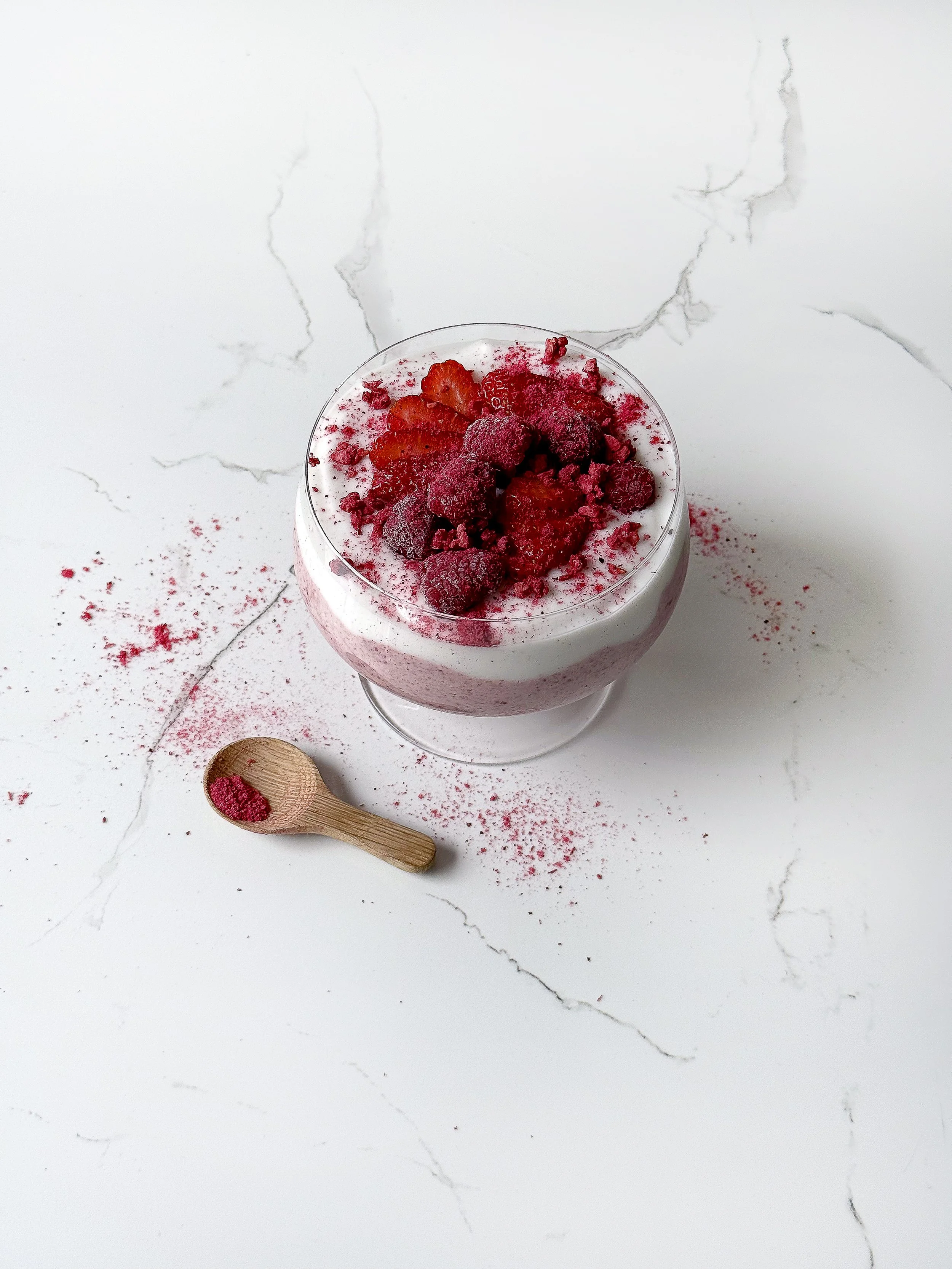 Morning, time to dish up. Firstly, wash and slice up your strawberries. Layer the overnight oats, vanilla yoghurt, strawberries and raspberries. Garnish with Davidson plum powder and freeze dried broken raspberries.