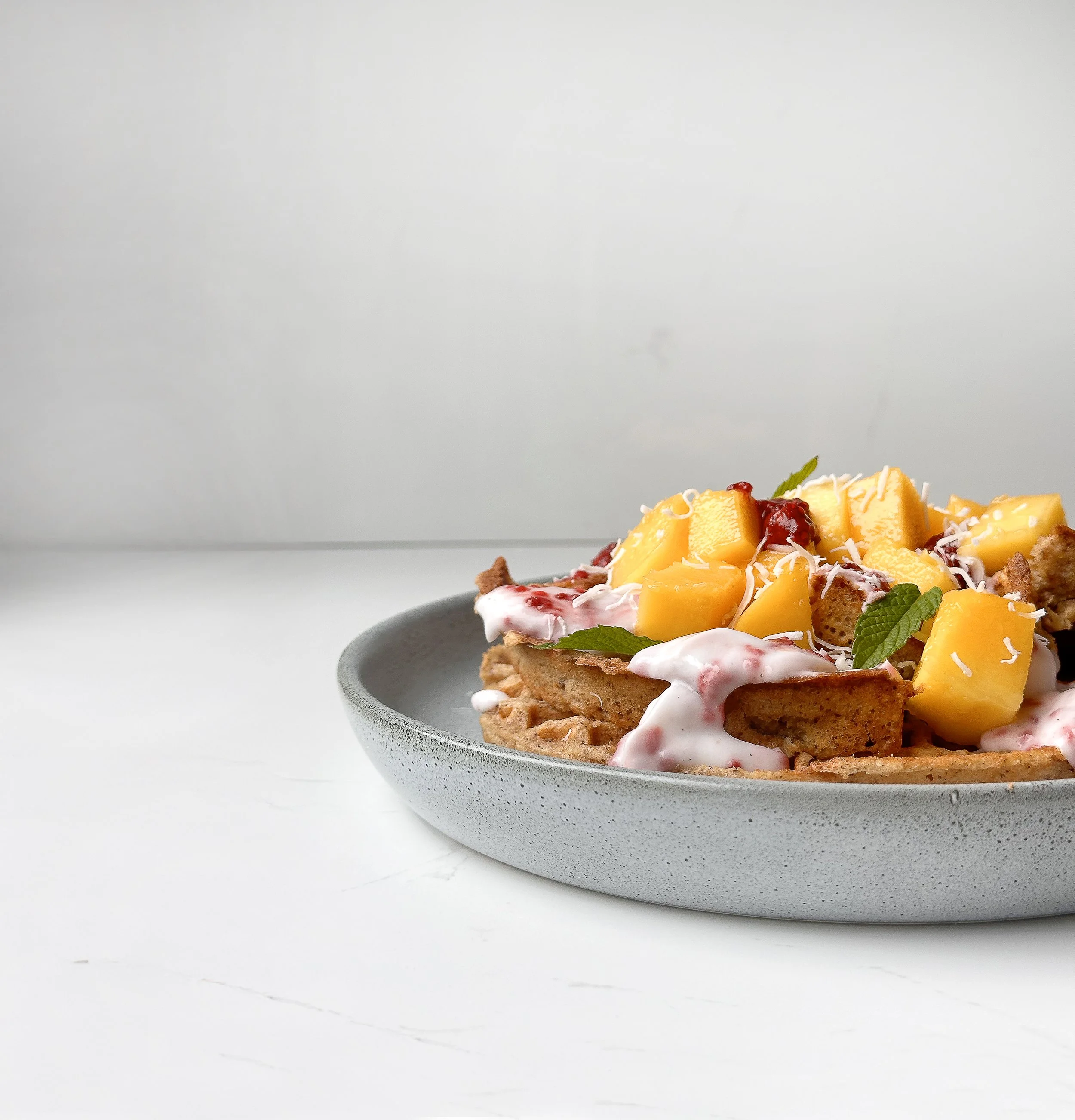 Top with mangoes, coconut yoghurt, raspberry chia jam and shredded coconut. (Or whatever tickles your fancy!)